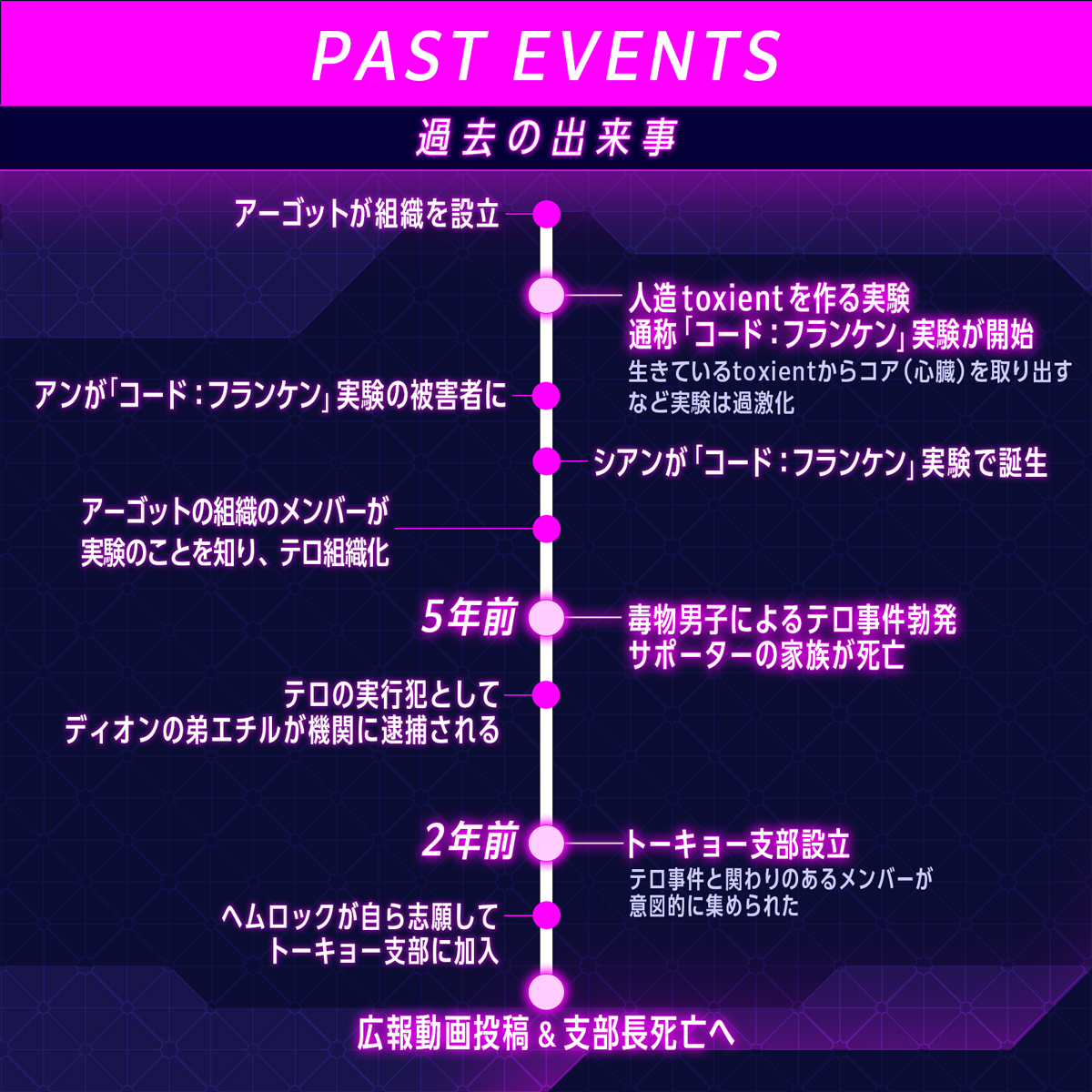 「コード:フランケン」実験の存在を彼らが知ったことが直接的な原因だったが、機関はそれを伏せており、toxientたちの唐突な暴動として世には知られていた。
