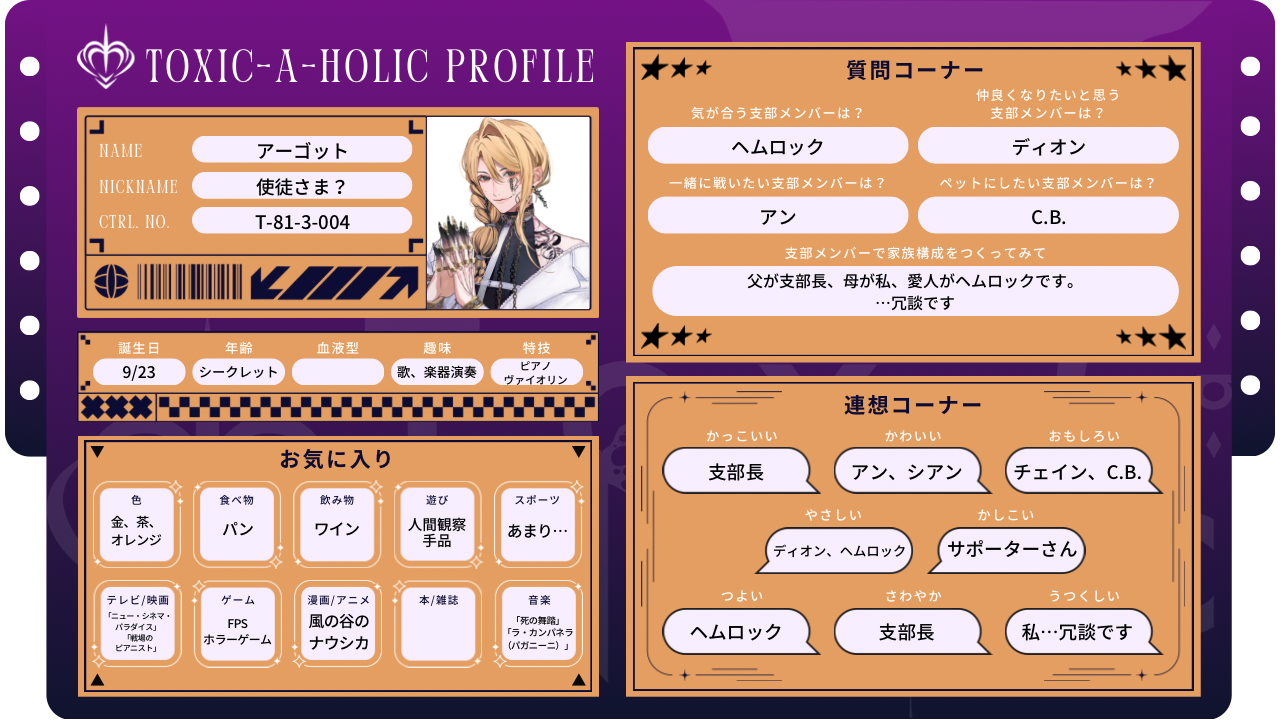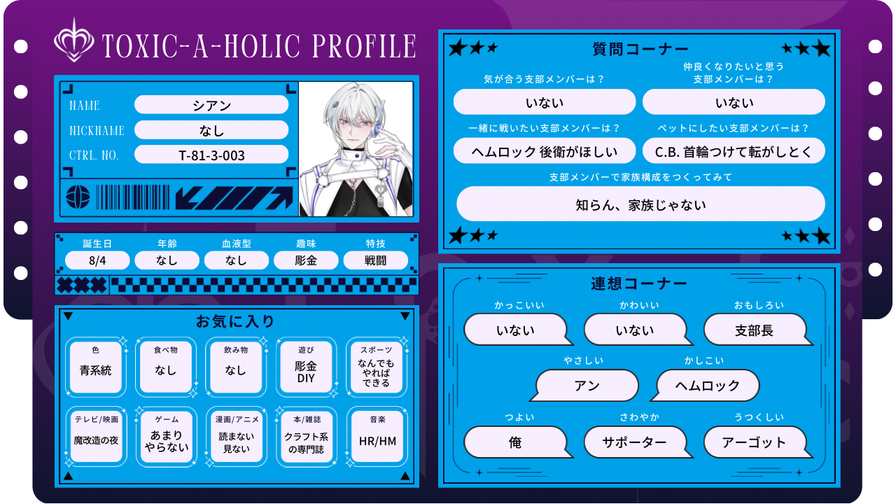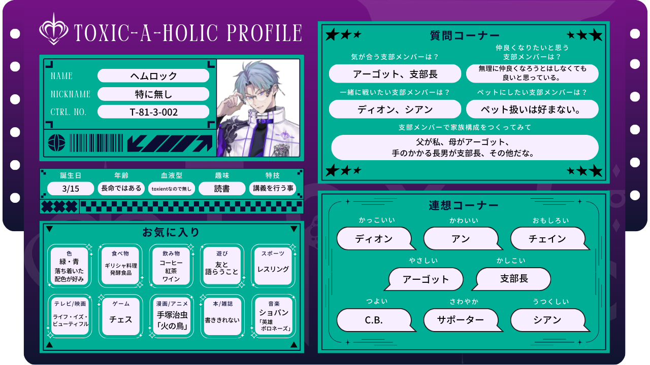 2025.11.13 プロフィール帳:アーカイブ アン-プロフィール帳- ヘムロック-プロフィール帳- シアン-プロフィール帳- アーゴット-プロフィール帳- ディオン-プロフィール帳- C.B.-プロフィール帳- チェイン-プロフィール帳- 支部長-プロフィール帳- サポーター-プロフィール帳- SHARE PREV BACK TO LIST NEXT