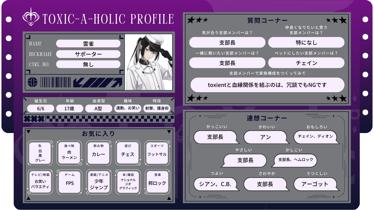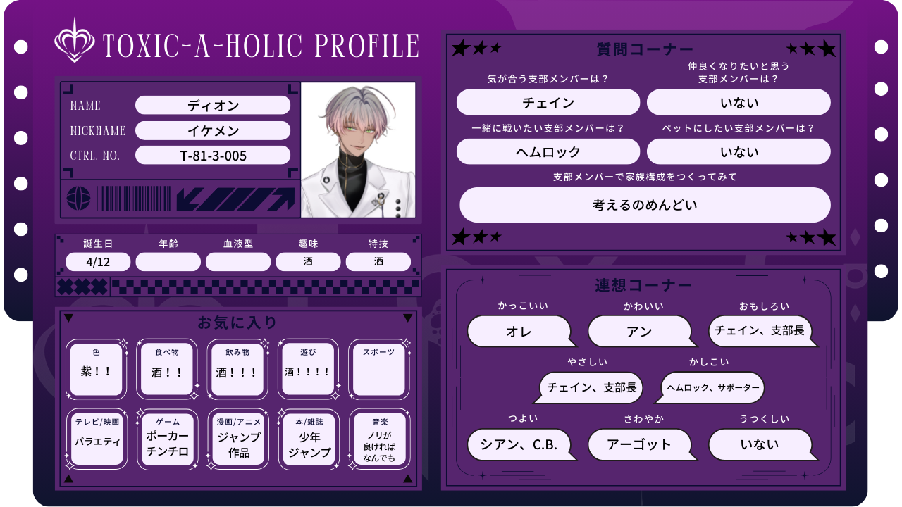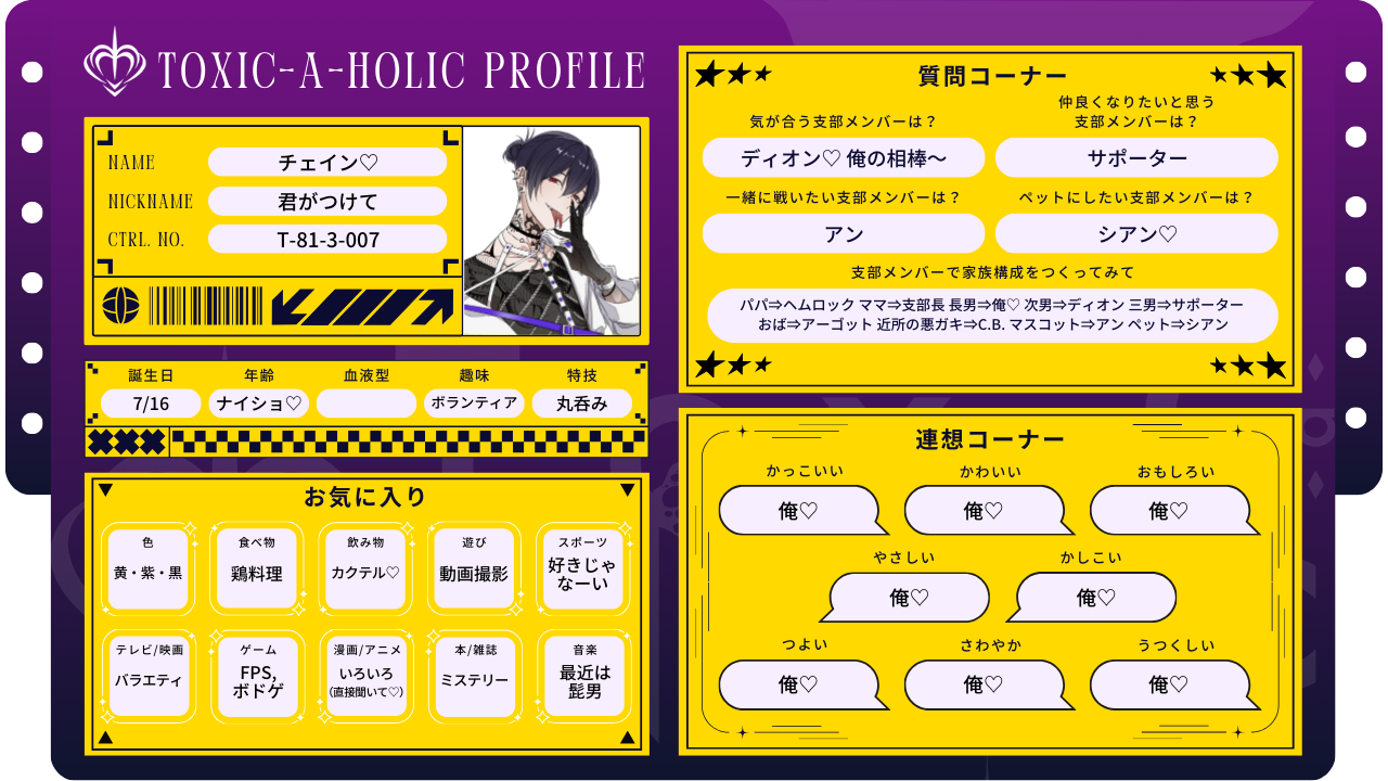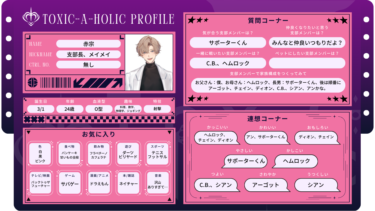 2025.11.13 プロフィール帳:アーカイブ アン-プロフィール帳- ヘムロック-プロフィール帳- シアン-プロフィール帳- アーゴット-プロフィール帳- ディオン-プロフィール帳- C.B.-プロフィール帳- チェイン-プロフィール帳- 支部長-プロフィール帳- サポーター-プロフィール帳- SHARE PREV BACK TO LIST NEXT